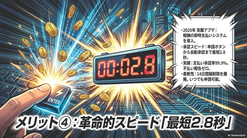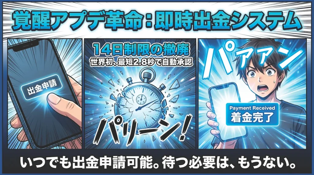 出金については「問題なく振り込まれた」という報告が非常に多いです。2025年8月の即時報酬アップデート以降は、支払い申請から最短2.8秒で自動承認され、着金もスピーディーになっています。