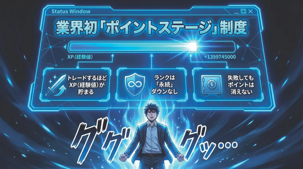 ポイントステージは、日々の取引やアクションで「XP(ポイント)」を獲得し、ポイントを貯めてランクを上げることで取引条件が永続的に向上する仕組みです。いわば“トレード版のポイ活”と言えます。