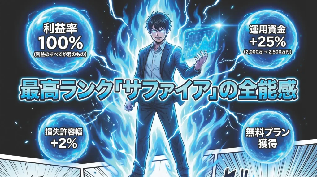 最高ランク6に到達すると、報酬率が最大100%(基本80%+20%ブースト)となり、利益のすべてが手元に残ります。さらに運用資金も+25%拡大されるため、より大きな利益を狙えるようになります。