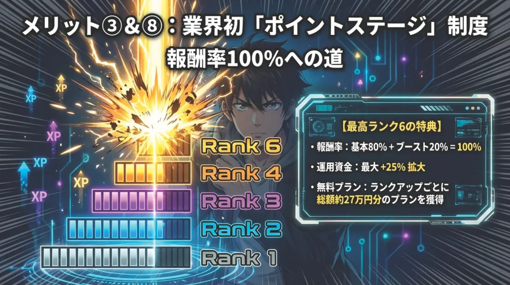 日々の取引やアクションでXP(ポイント)を獲得し、ランクを上げることで報酬率アップ(最大+20%)、運用資金拡大(最大+25%)、損失制限緩和(最大+2%)、新プラン無料獲得といった永続的なブースト特典が解放されます。