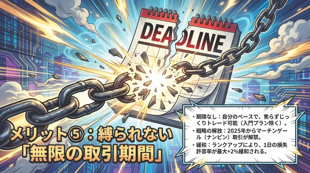 FTMOなど海外の大手プロップファームと比較して、ルールが緩いという評価が多いです。特に取引期限がない点(30日間に1回以上の取引でOK)は、じっくり派のトレーダーから好評です。