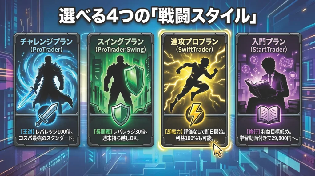トレード経験があり、じっくり取り組みたいならチャレンジプラン。すぐに本番環境で取引したい、チャレンジに時間をかけたくないなら速攻プロプランが向いています。