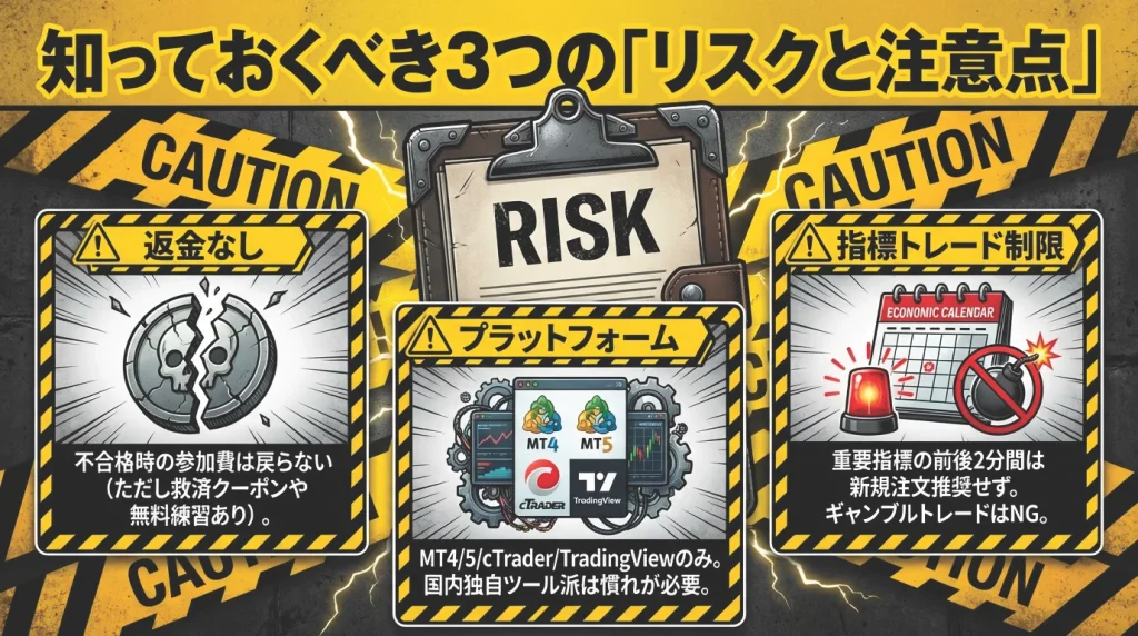 合格率はあまり高くありませんが、しっかりとリスク管理ができるトレーダーであれば合格は十分可能です。逆に、無計画なトレードやオーバーレバレッジで失格になるケースも多いようです。
