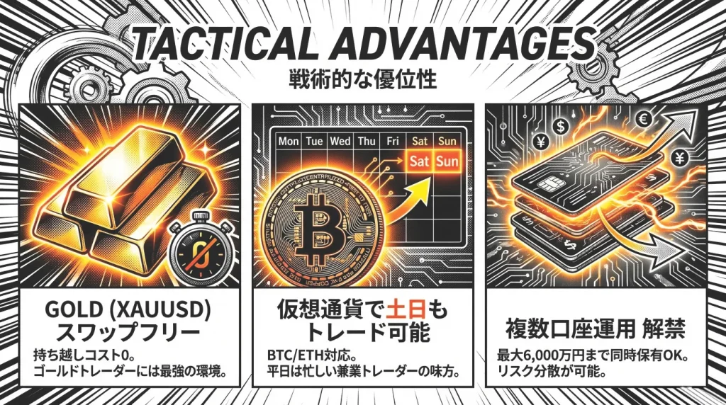 特にGOLD(XAUUSD)はスワップフリーで取引できるのが特徴です。また、ビットコインやイーサリアムなどの仮想通貨にも対応しているため、土日も取引が可能です。