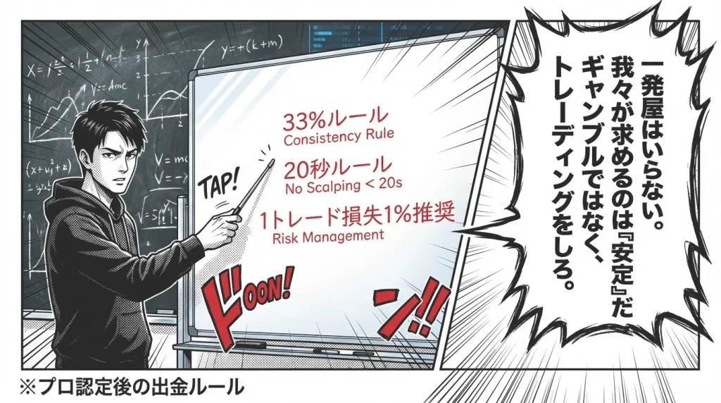 1日の大勝ちに依存せず、安定したトレードで継続的に利益を積み上げることが求められます。違反しても即失格にはなりませんが、報酬が一時保留され、追加トレードで調整が必要となります。