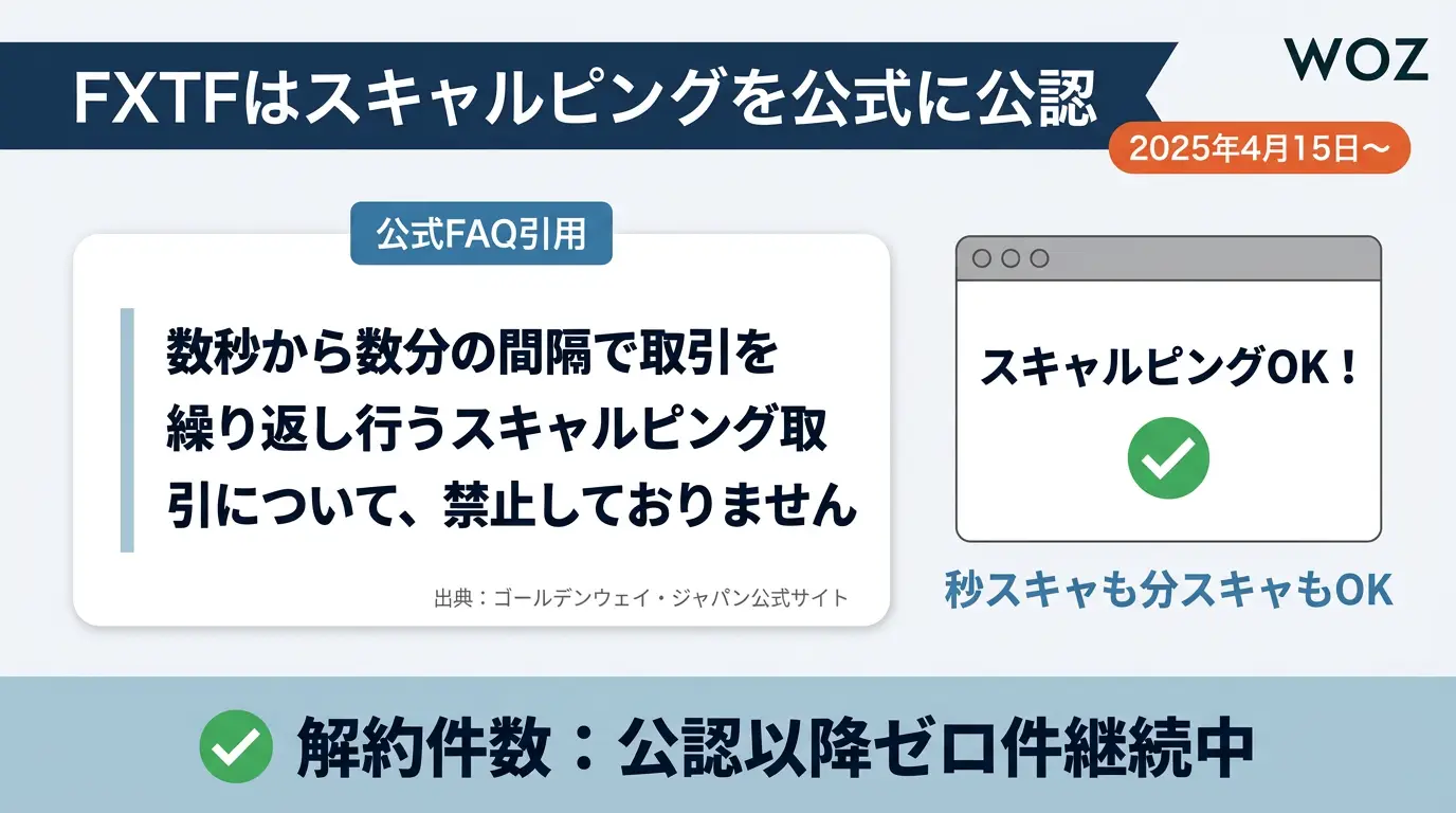 FXTFを運営するゴールデンウェイ・ジャパンは、2025年4月15日にスキャルピング取引の公認を正式に発表しました。公式サイトには「当社取引システムではスキャルピングOKです!」と明記されており、FXTF GX・FXTF MT4の両サービスで超短期売買が可能となっています。