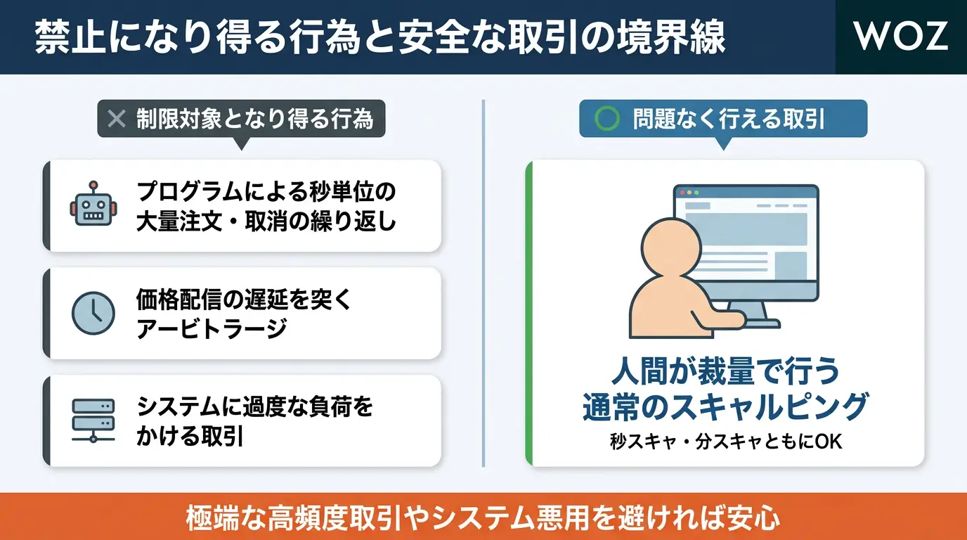 ただし、人間が裁量で行う通常のスキャルピングであれば問題ないとされています。極端な高頻度取引やシステムを悪用するような行為を避ければ、安心してスキャルピングを行えます。