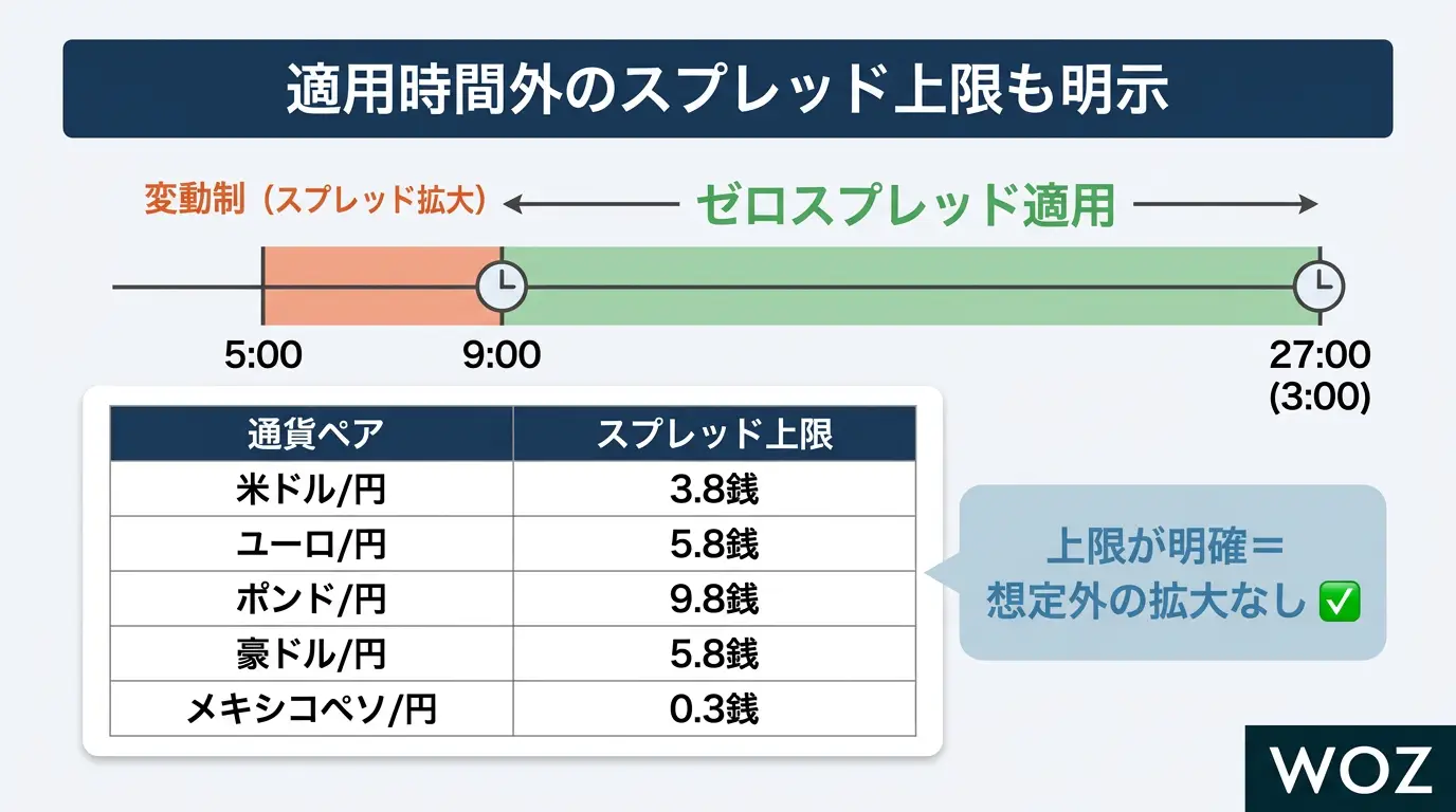 ゼロスプレッドの適用時間外(早朝5:00〜9:00など)は、スプレッドが変動制となりますが、上限値が明示されている点も安心材料です。