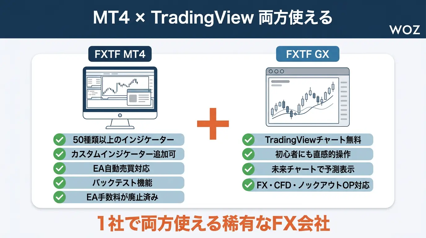 FXTF GXはTradingViewを搭載した使いやすいツールで、インストール不要で手軽に始められます。MT4はEAやカスタムインジケーターを使いたい方、より高度な分析をしたい方向けです。