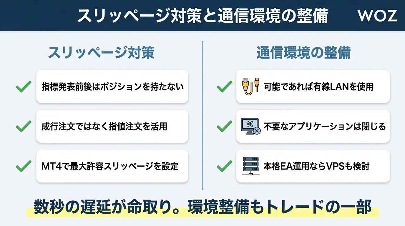 重要経済指標の発表時は相場が急変しやすく、どのFX会社でもスリッページが発生しやすくなります。FXTFでは指値注文の活用や許容スリップの設定を推奨しています。