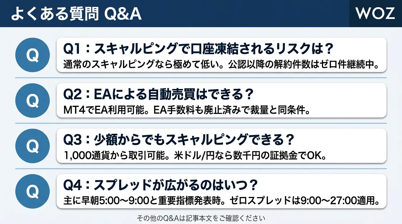 公式FAQに「数秒から数分の間隔で取引を繰り返し行うスキャルピング取引について、禁止しておりません」と明記されており、秒スキャを含むスキャルピングが可能です。