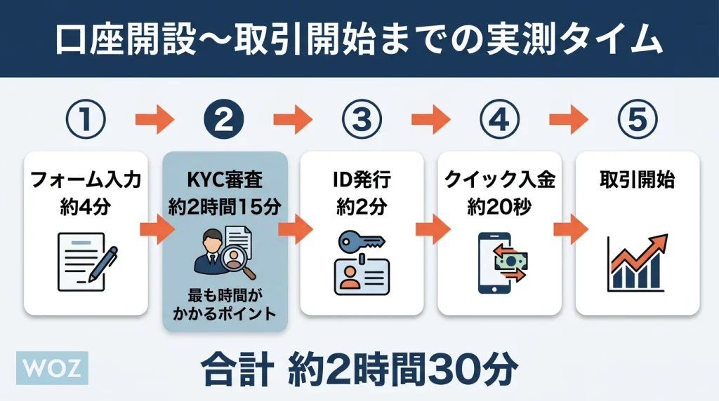 | 申請から最初の取引完了まで | 合計約2時間30分 | 書類に不備がない場合の最短目安 |