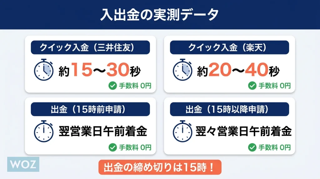 | 初回入金〜口座残高反映 | 約20秒(クイック入金) | 三井住友銀行のネットバンキング経由で計測 |
