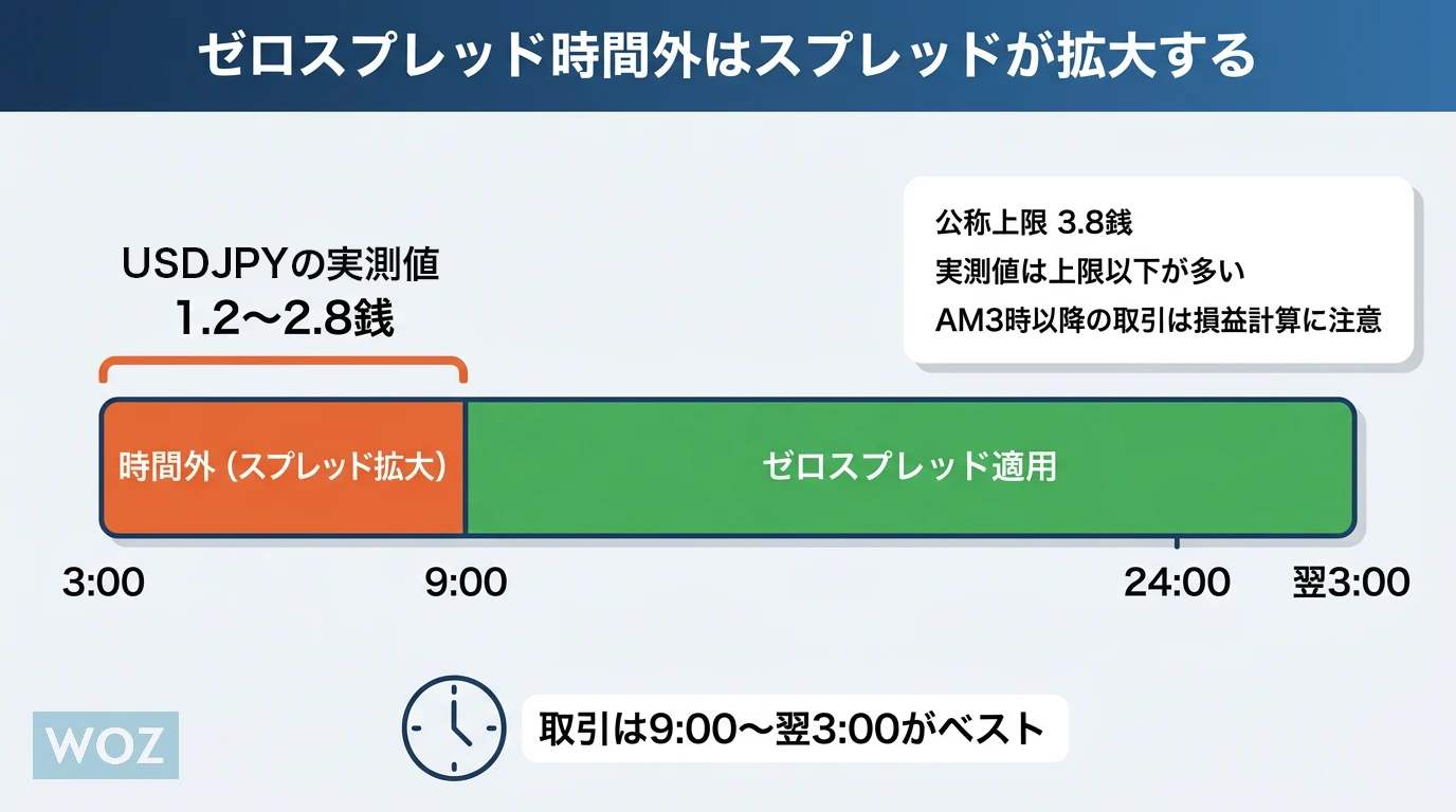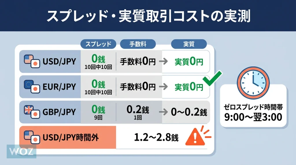 当編集部(合同会社WOZ)が実際に口座を開設・運用した結果、ゼロスプレッドは東京時間帯において公称通り機能しており、1万通貨以下の取引では手数料もゼロになることを実測で確認しました。