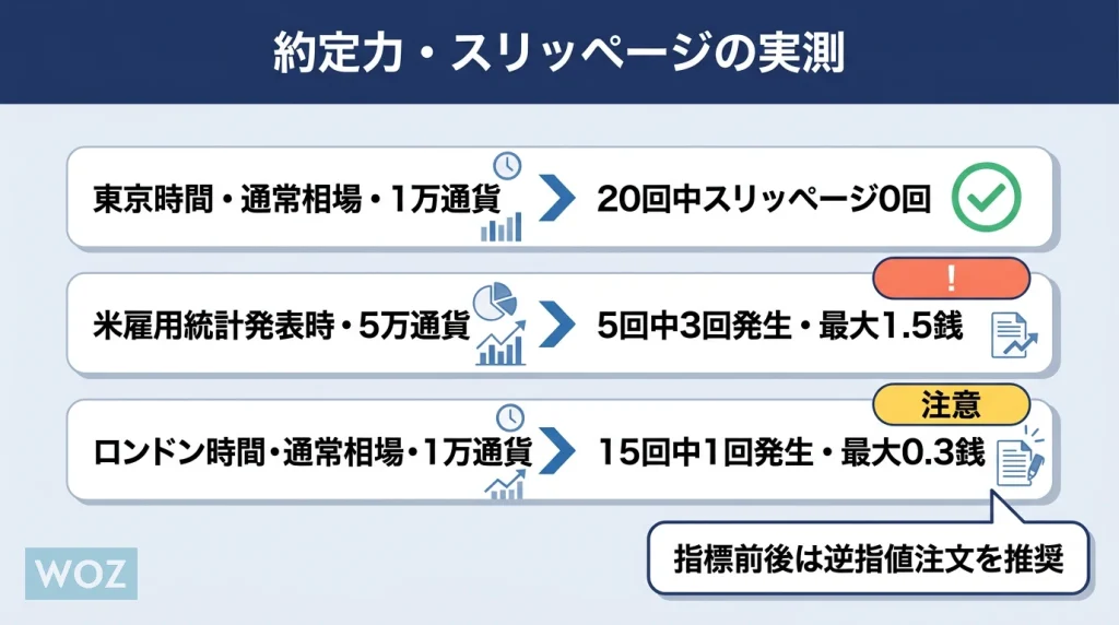当編集部では、USD/JPYを対象に東京時間帯(流動性の高い時間帯)と指標発表前後のそれぞれで成行注文を複数回実施し、スリッページ発生率を確認しました。