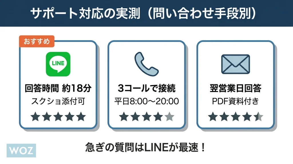 当編集部では、LINE・メール・電話の3つのサポートチャネルをそれぞれ実際に利用しました。