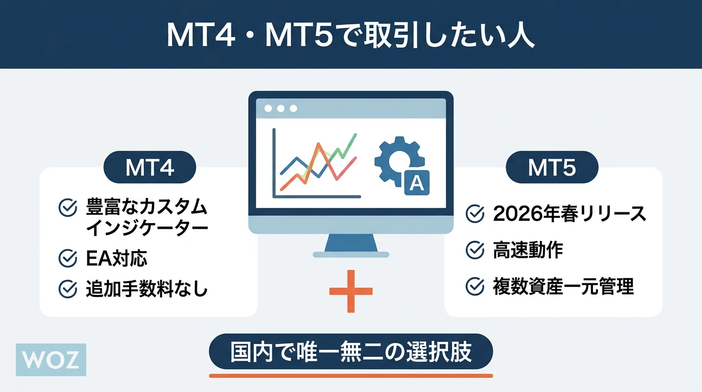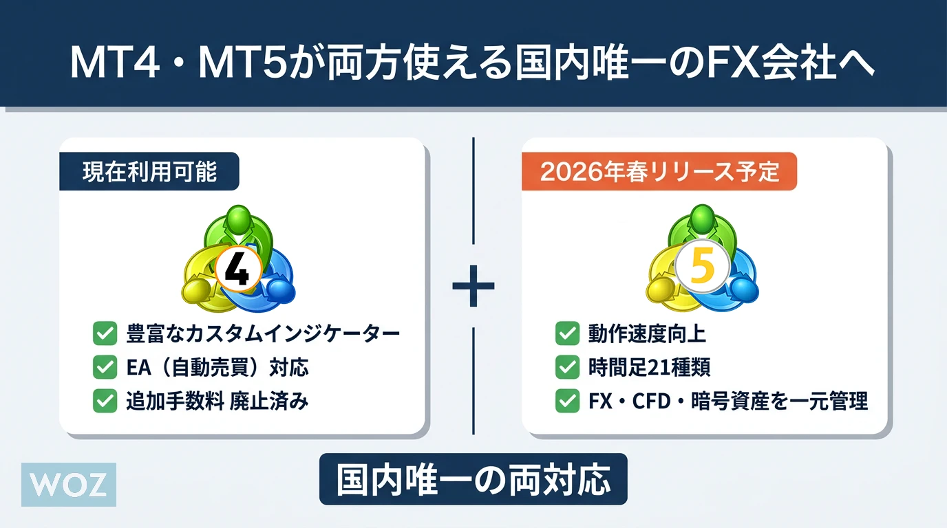 また、国内では数少ないMT4対応、かつMT5も2026年春リリース決定済みのFX会社として、高度なチャート分析や自動売買プログラム(EA)の利用が可能です。EA追加手数料も廃止されており、プロ級のトレード環境を手に入れられます。