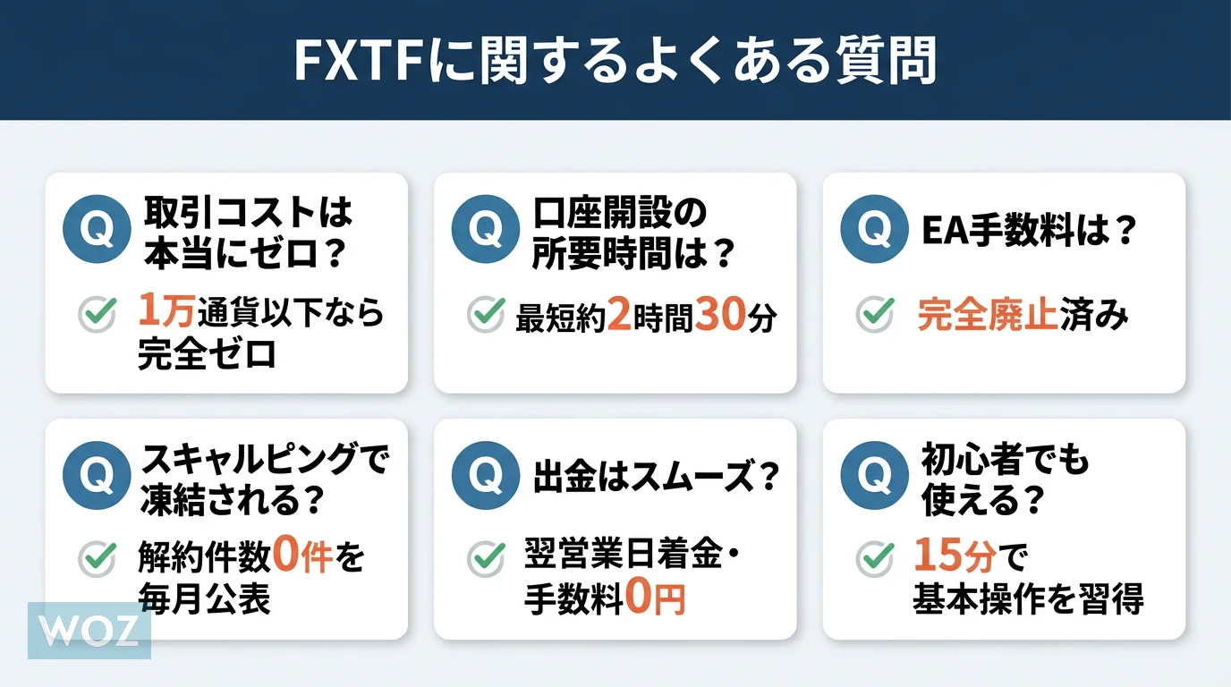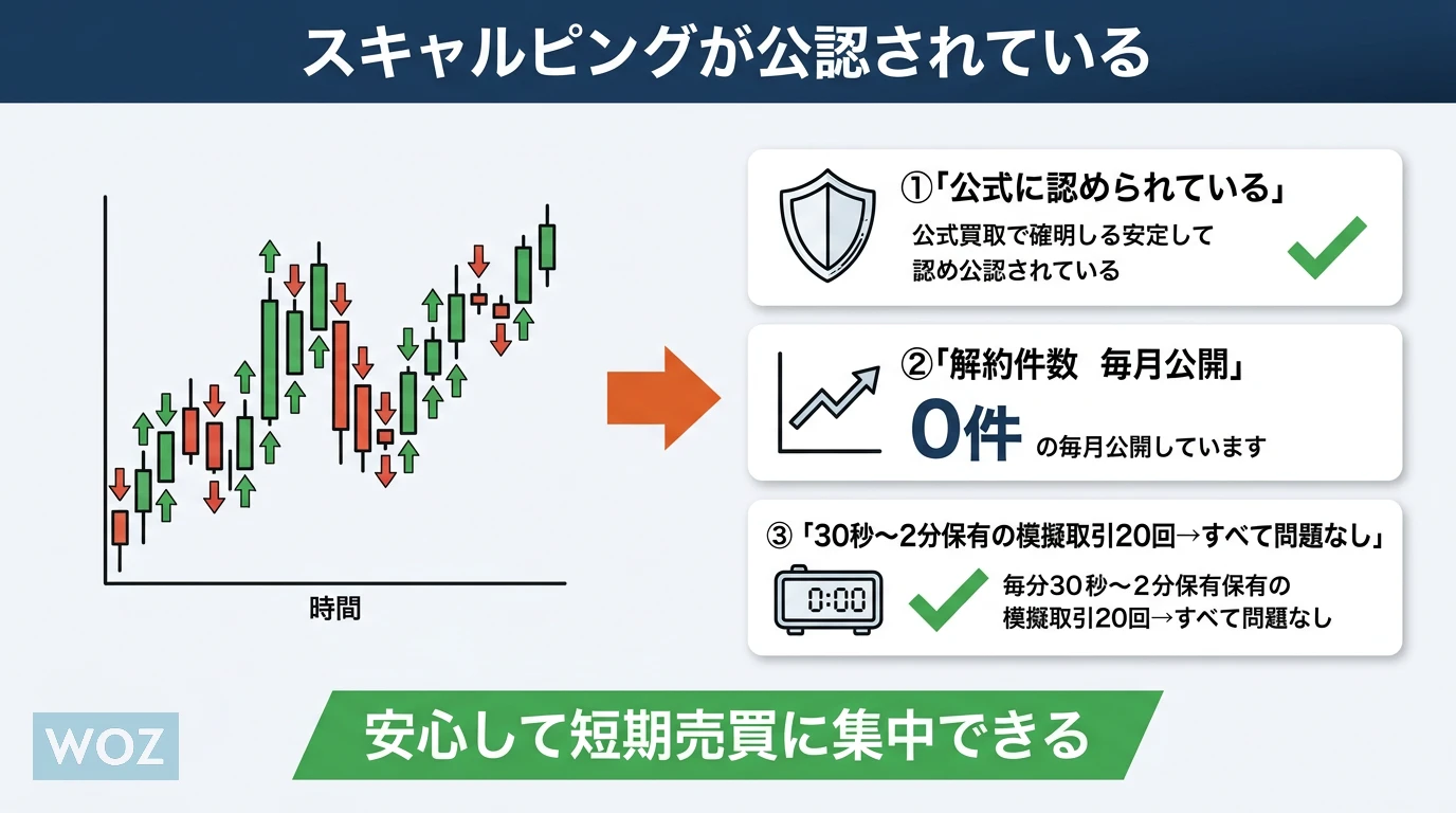 さらに注目すべきは、FXTFが「スキャルピングによる解約状況の透明化」を宣言していること。毎月、スキャルピングが原因で解約された件数を公式サイトで公開しており、その件数は継続してゼロと報告されています。この透明性の高さは、トレーダーが安心して短期売買に集中できる大きな根拠となっています。