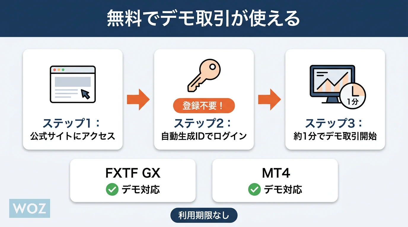 実際にお金を投入する前に練習したい人にぴったりなのが、FXTFの無料デモ口座です。