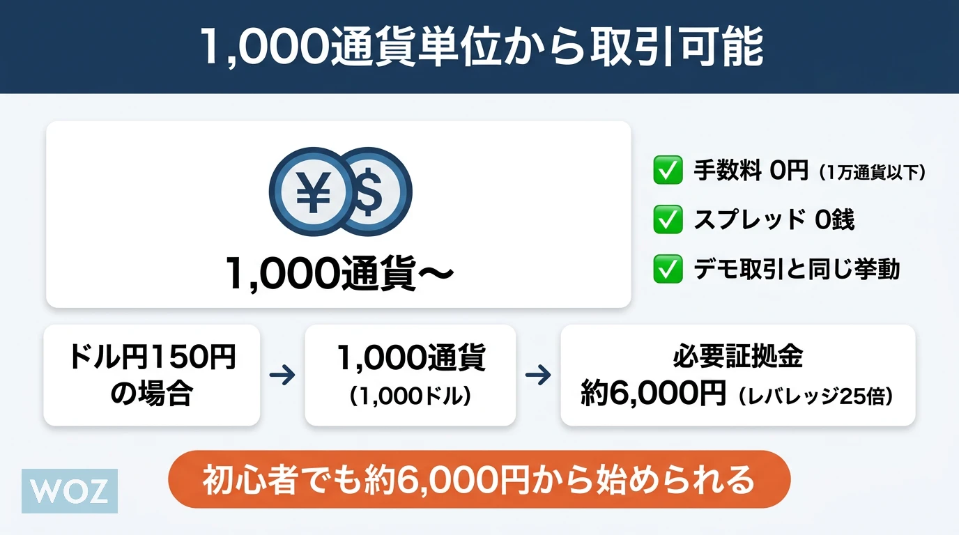 例えば、ドル円が158円のとき、1,000通貨(1,000ドル)の取引なら、必要証拠金は約6,320円程度(レバレッジ25倍の場合)。ゼロスプレッドと建玉連動手数料の導入により、多くの通貨ペアで1万通貨以下の取引は手数料無料となりました。1,000通貨の取引でも当然ランク1(手数料0円)が適用されるため、コストゼロで気軽に始められます。