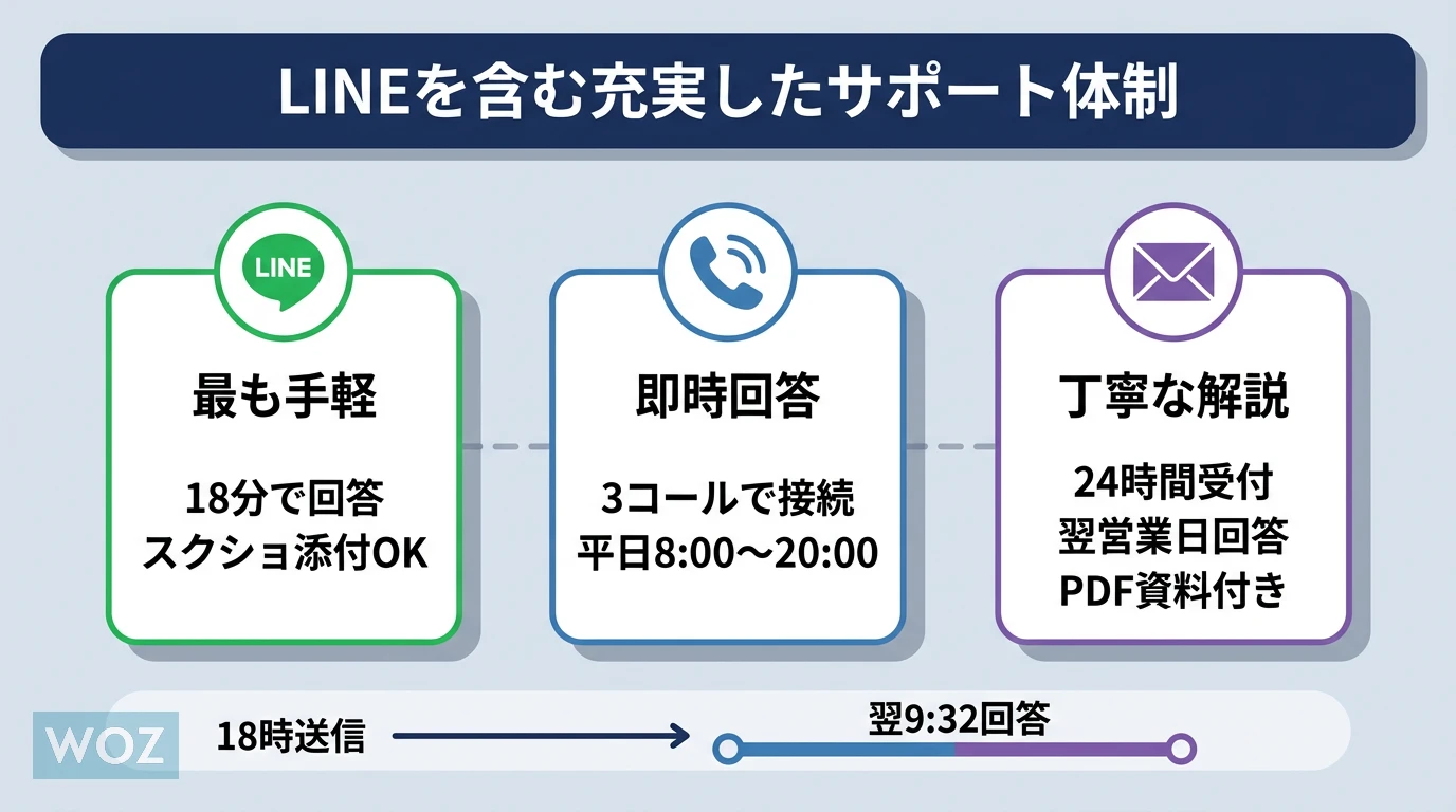 サポート体制も充実していて、特にLINEでの気軽な問い合わせができるのは現代的。当編集部の実測ではLINE送信から18分以内に具体的な回答が届き、スクリーンショットを添えた質問にもすぐ対応してもらえました。