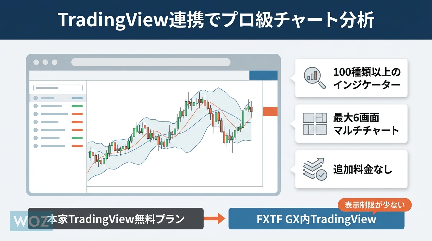 初心者の方にも嬉しいのが、操作が直感的な独自取引ツール「FXTF GX」の存在。TradingViewと連携しており、プロ仕様の分析環境も実現しています。29種類の通貨ペアに加え、商品CFDや暗号資産CFDも取引可能です。