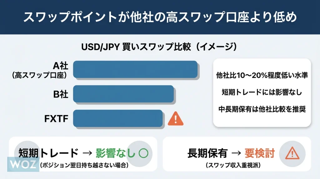 FXTFでの10,000通貨あたりのスワップポイントは以下の通りです。(2026年4月15日時点の参考値。スワップポイントは日々変動するため、最新値は公式スワップカレンダーをご確認ください)