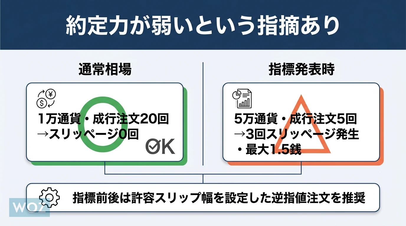 | 約定力 | 6/10 | 通常相場での約定はほぼ問題なし。 重要指標発表時の大ロット成行注文では若干のスリッページあり(実測値)。 |