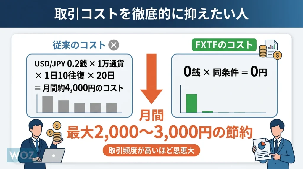 はい、条件によっては完全にゼロになります。FXTFではゼロスプレッドを導入しているため、スプレッドコストはかかりません。さらに、新設された「建玉連動手数料」も、多くの通貨ペアで1万通貨以下の新規取引の場合は手数料が0円です。