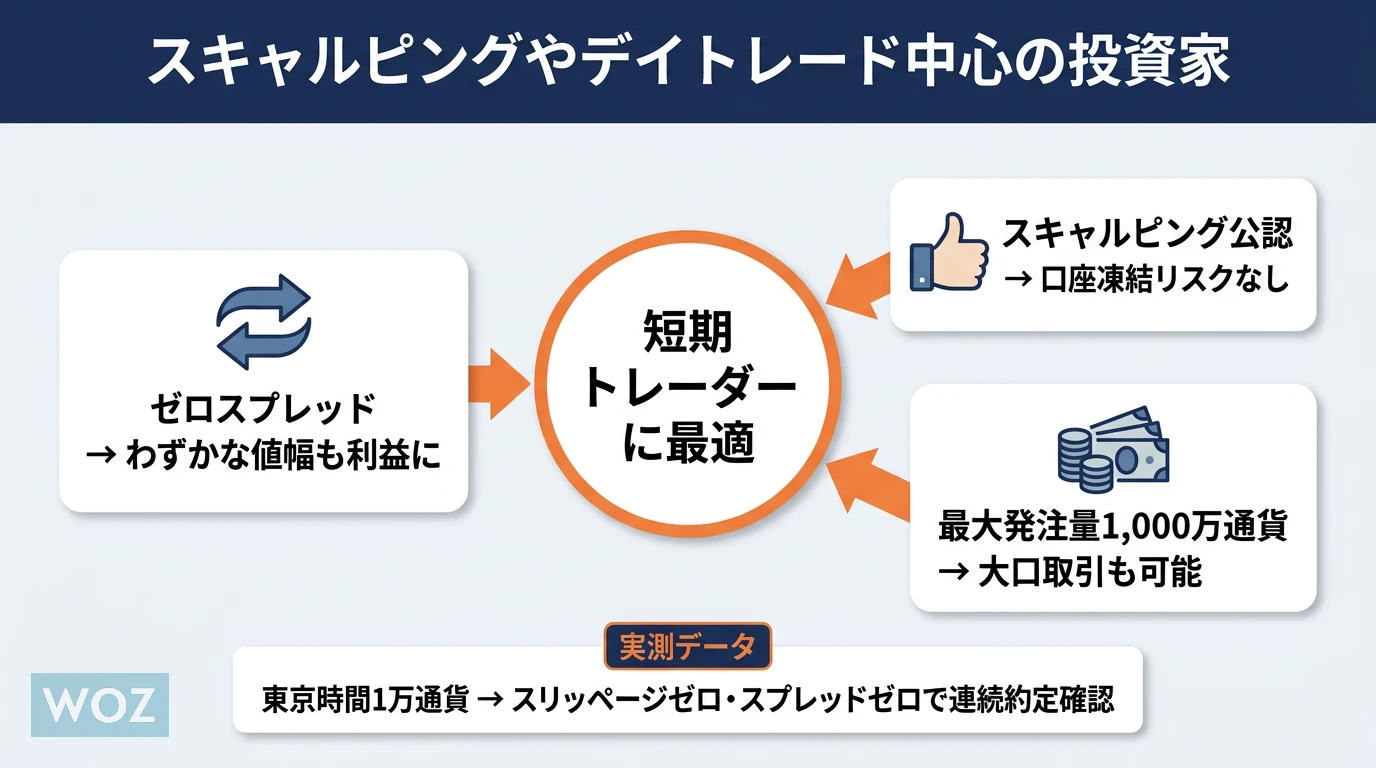 最大の革新は、やはり全通貨ペア・CFD対象銘柄での「ゼロスプレッド」です。これにより、取引コストを徹底的に抑えられ、特にスキャルピングやデイトレードといった短期売買を行うトレーダーにとって有利な環境が実現しました。
