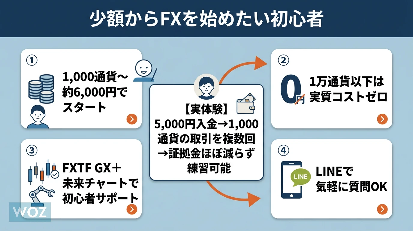 はい、初心者の方にもおすすめです。1,000通貨という少額から取引を始められるうえ、1万通貨以下の取引なら実質コストゼロでFXを体験できます。また、直感的に操作できる取引ツール「FXTF GX」や、相場予測を助けてくれる「未来チャート」、LINEでの手厚いサポートなど、初心者を支える環境が整っています。