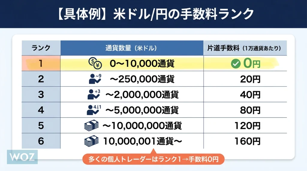 この表からわかるように、米ドル/円の買いポジションと売りポジションがそれぞれ1万通貨以下であれば、新規取引時の手数料は完全に0円です。多くの個人トレーダーにとって大きなメリットです。詳細な手数料テーブルは公式サイトでご確認ください。