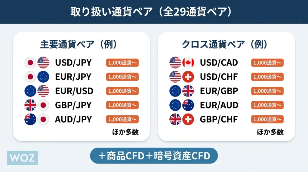 | 通貨ペア | 8/10 | 29種類の通貨ペアに加え、商品・暗号資産CFDも取引可能。 幅広い金融商品に対応。 |