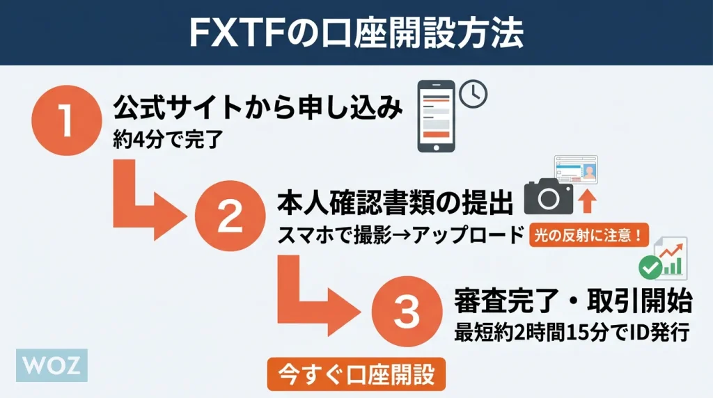 FXTFの口座開設は、スマートフォンから最短5分で完了します。以下の3ステップで簡単に申し込めます。
