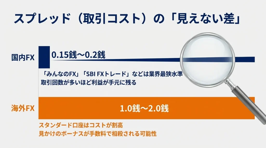 国内FXはドル円など主要通貨ペアで0.15~0.2銭程度といった極狭スプレッドが一般的で、コスト面で優れています。2026年現在、みんなのFXやSBI FXトレードなどでは0.15銭という業界最狭水準のスプレッドを提供しています。