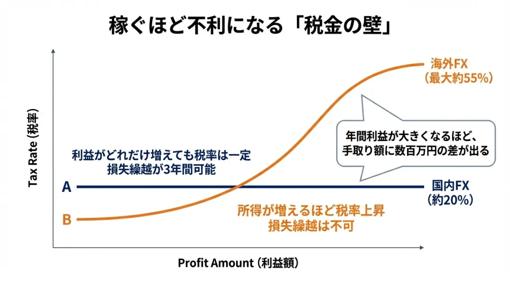 海外FXは総合課税の雑所得扱いで、所得が増えるほど税率が上がる累進課税になるため、高い利益を得るほど税負担が大きくなります。年間所得が330万円を超えると、海外FXの税率は国内FXの20.315%を上回るため、多くのトレーダーにとって不利になりがちです。