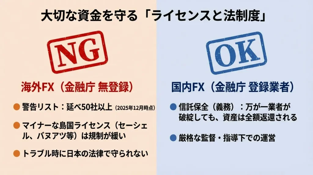 国内FX業者は日本の金融庁に登録し、信託保全による顧客資金の保護が義務づけられています。