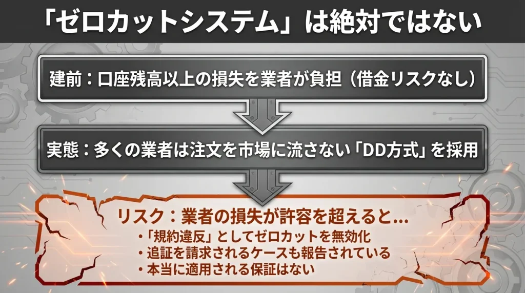 通常、ゼロカット制度を導入するには、業者側が顧客からの注文をマーケットへカバー(注文を流す)している必要があり、業者の取り次ぎリスクは限定的なはずです。