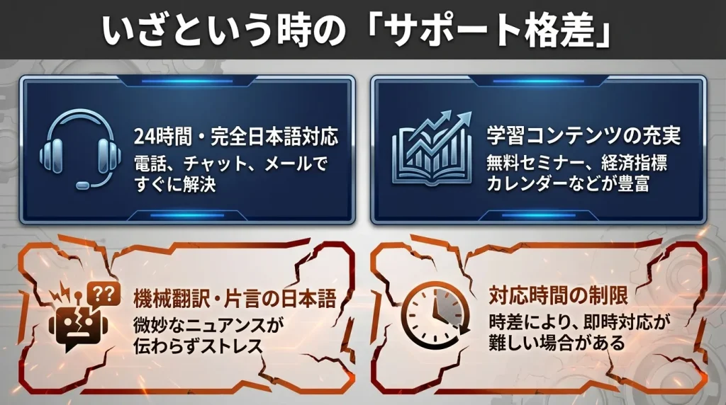 海外FXも日本語サポートを提供する業者が増えていますが、対応時間が限られていたり、翻訳クオリティに難がある場合があります。サポート重視なら国内FXが安心です。