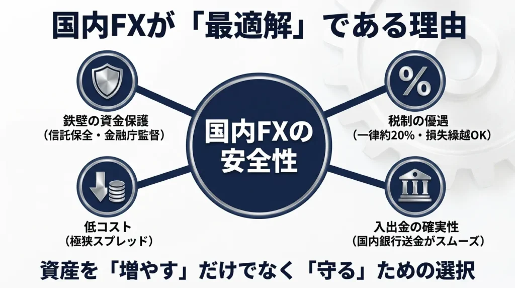 ここまで海外FXのリスクを多角的に見てきましたが、国内FXは具体的にどのようなメリットがあるのでしょうか?
