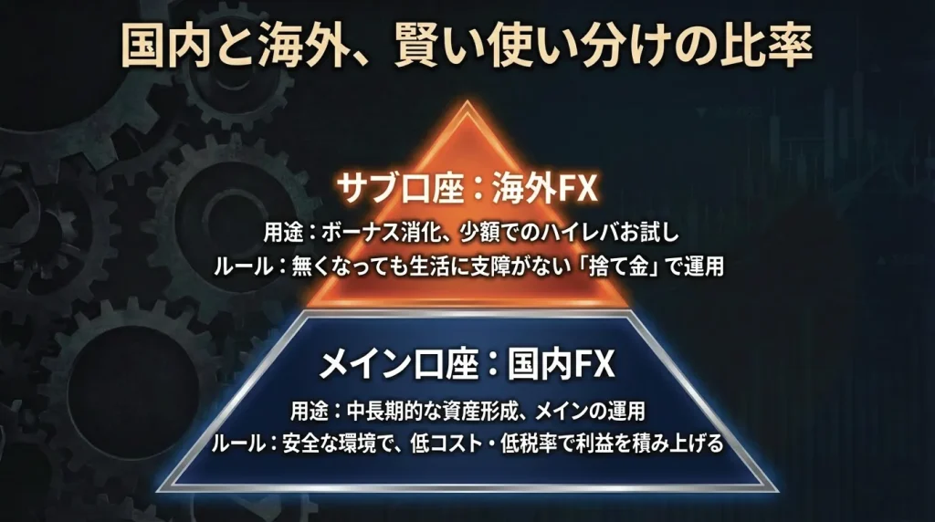 例えば「一時的にボーナスを利用して遊んでみたい」「少額資金でEAを動かしたい」といった目的がある場合は海外FXに少額を入れて運用し、大きな資金は安全性が高い国内FXに置いておく、といった形です。