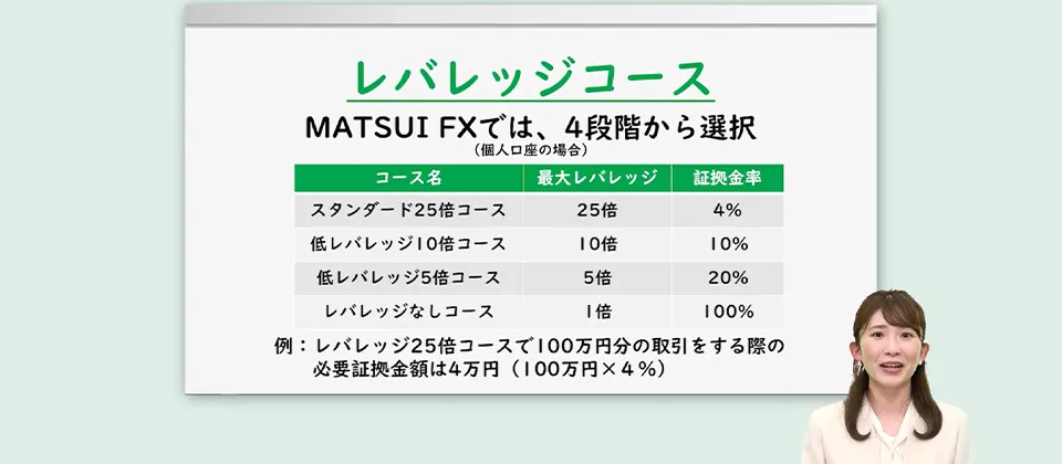 MATSUI FXなら、口座開設後もその時々の投資方針に合わせてレバレッジを変えられるので、状況に応じた柔軟な取引が可能となっています。