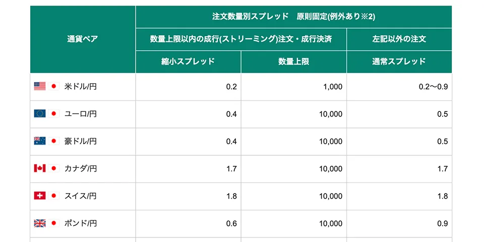 例えば、USD/JPYのスプレッドは0.2銭、EUR/JPYは0.4銭と非常に狭く設定されていて、スプレッドは原則固定制なので、相場の急変時にもスプレッドが大きく広がるリスクが少ないのが特徴です。