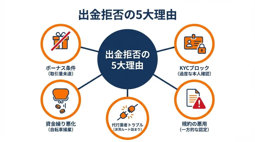 出金拒否が起きる主な原因を、ひとつずつ見ていきます。