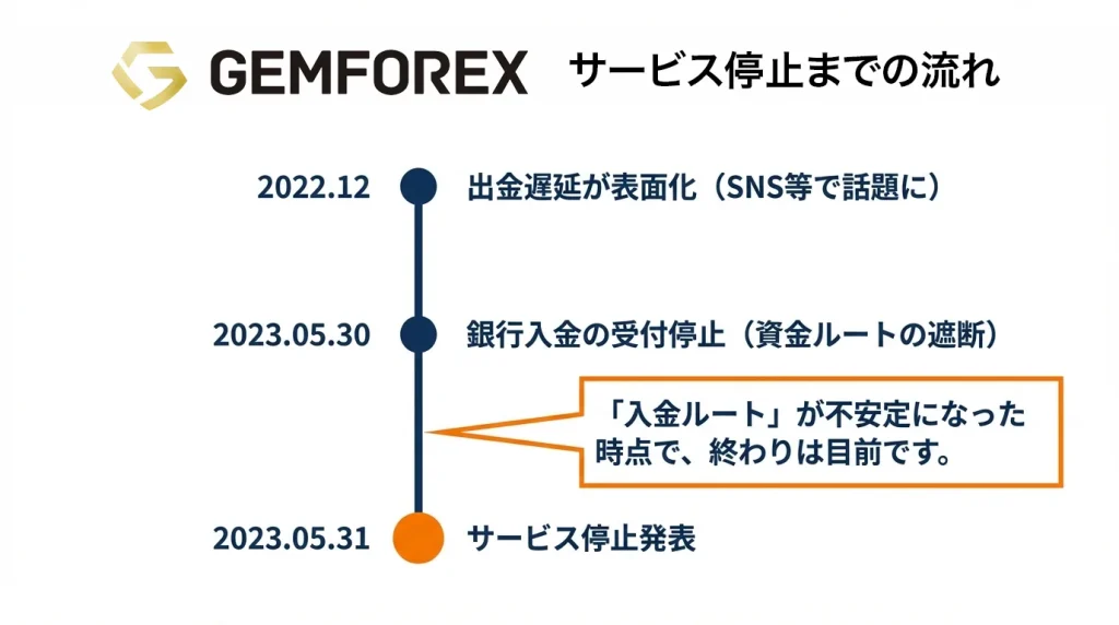 利用者から見ると、ある日突然「入金できない」「出金が止まった」という形で影響が出ることになります。GEMFOREX事例でも、サービス停止の前日に銀行入金ができなくなったことが報じられており、入金ルートの不安定化は現実に起きているリスクです。
