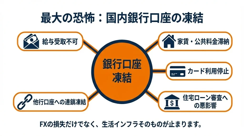 銀行口座の凍結は、海外FXの取引資金が失われるだけの問題ではありません。生活全体に影響が及びます。