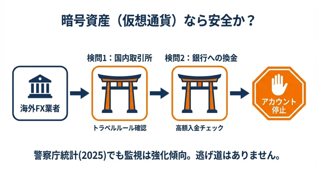 たとえば、海外FX業者が暗号資産での出金処理を完了しても、受け取り側の国内取引所で「この送金は確認が必要です」と保留になることがあります。取引所の確認が終わっても、そこから日本円に換金して銀行に送る段階で、今度は銀行側の審査にかかることもあります。