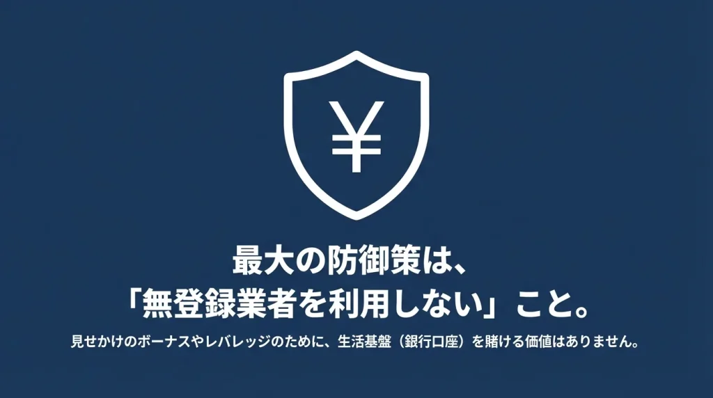 まとめとして、海外FXにおける最大の防御策は「日本の金融庁に未登録の業者を利用しないこと」に尽きます。