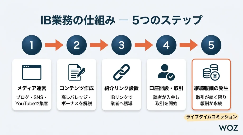 IB(Introducing Broker、イントロデューシング・ブローカー)とは、その名の通り、FX業者に新規顧客を「紹介」するブローカーを指します。海外FXの世界では、事実上の「口座開設アフィリエイター」と考えて差し支えありません。