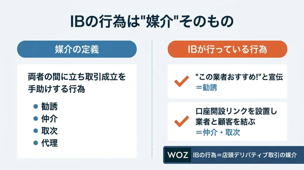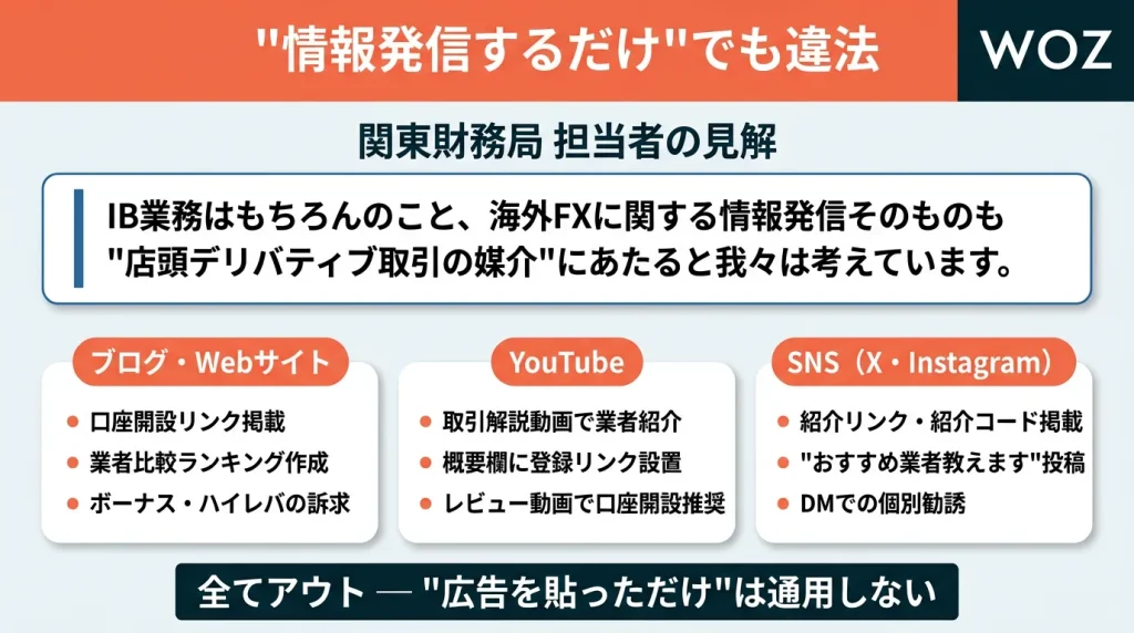 つまり、ブログ記事やYouTube動画、SNS投稿で海外FX業者を紹介したり、口座開設を促したりする行為そのものが、たとえ間接的であっても「媒介行為」と見なされる可能性がある、ということです。